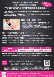 ※メールにてお申し込みの場合は、 ①氏名(フリガナ)、②連絡先(電話)、③所属組織、④参加方法(1. 会場参加、2. アーカイブ視聴)、⑤お弁当(500円)の有無、⑥講習会終了後の懇親会への参加希望の有無をご記載の上、info@saitama-sams.or.jp までお送り下さい。